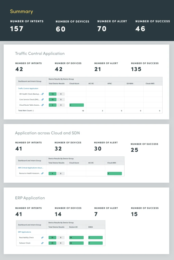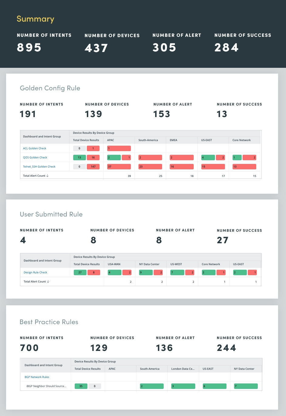 - Design and best practice rules: These rules outline industry-wide best practices for network configurations, ensuring that the network aligns with recognized standards and guidelines.