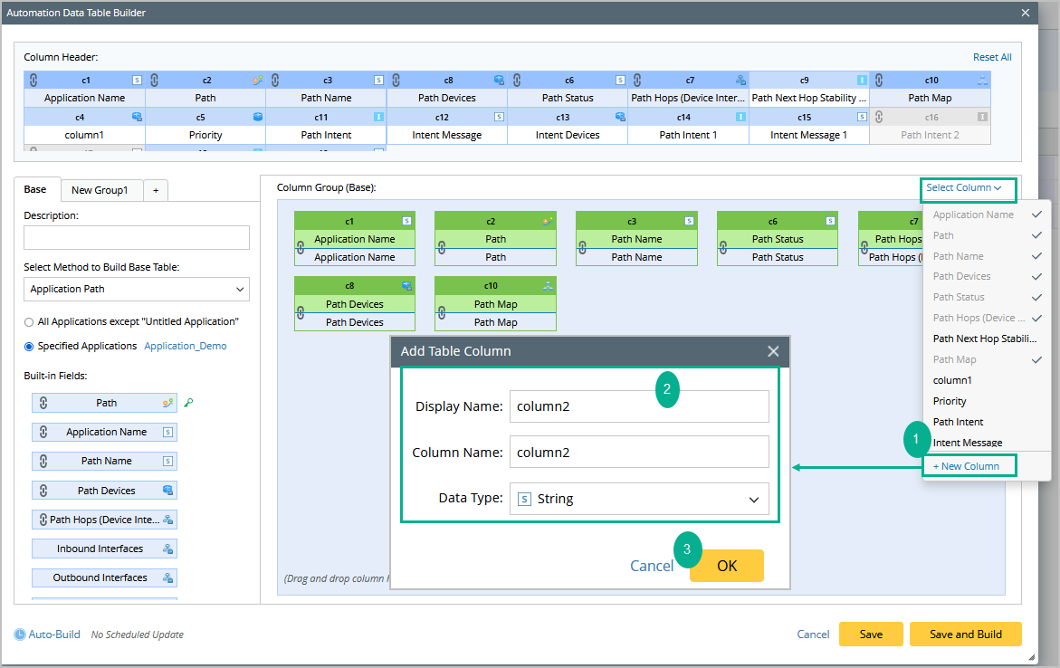 - Open the Automation Data Table Builder of the target ADT, then click + New Column from the Select Column drop-down list.