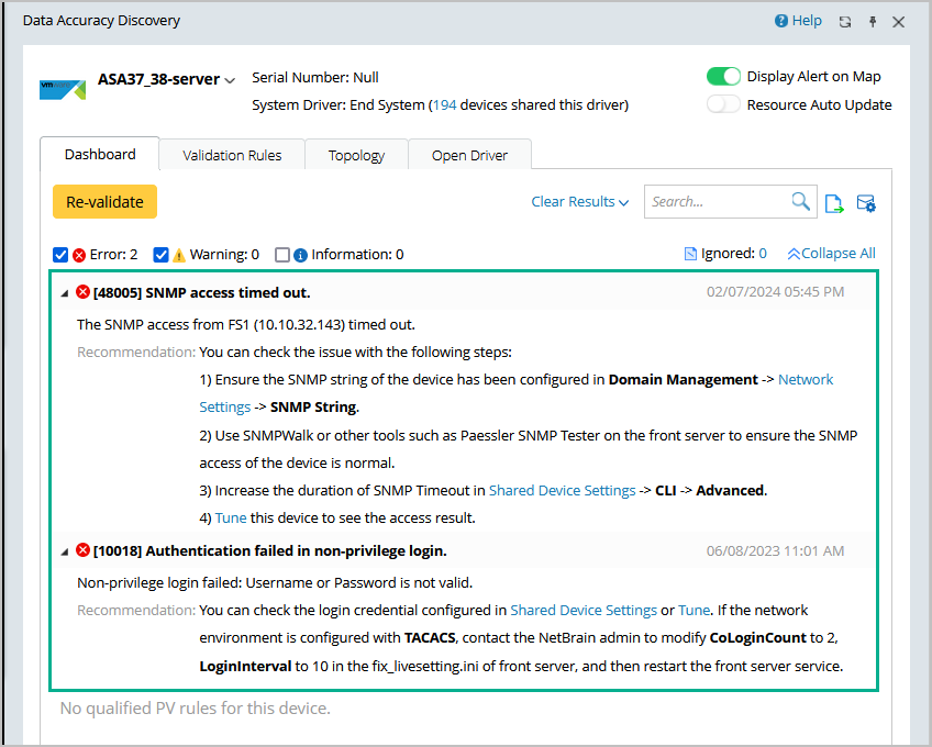 Platform Validation (PV) checks the data accuracy by executing a set of rules called PV Rule (PVR). Unlike System Validation which checks the live access status of devices, Platform Validation verifies the accuracy and completeness of device data, such as checking the device management IP or verifying the last update time for system tables. The PVR is created only by NetBrain Platform Engineers using a Python script file.