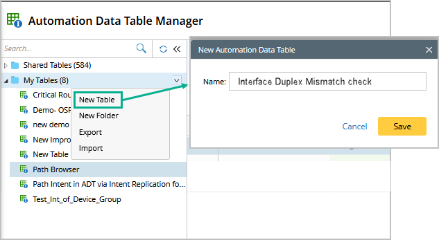 - Go to Automation Data Table, then create a new table and name it (for example "Interface Duplex Mismatch Check").