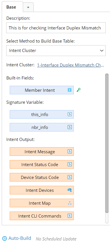 - Intent Cluster: Select the created intent cluster (for example, Interface Duplex Mismatch Check) for building the base table.