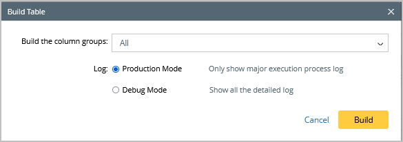 - Click Save and Build. The Build Table dialog appears, define the settings as per your preferences.