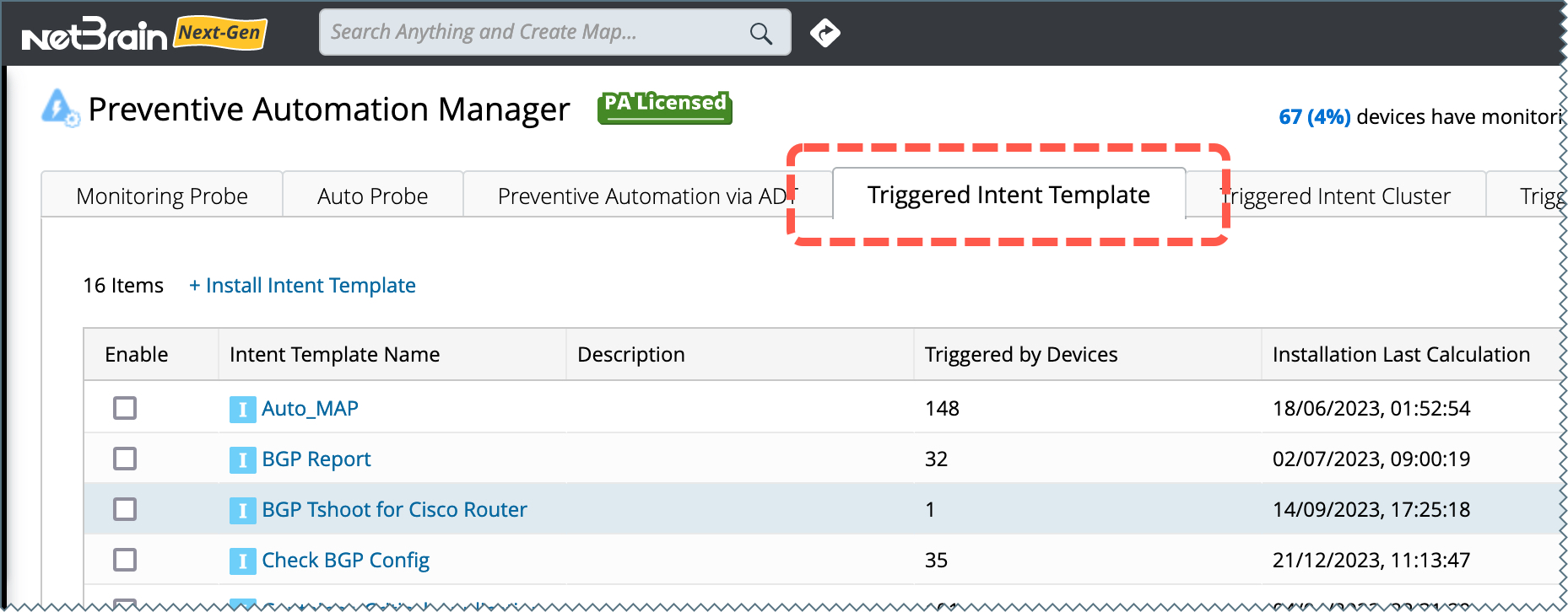 Go to Preventive Automation Manager and select Triggered Intent Template tab.
