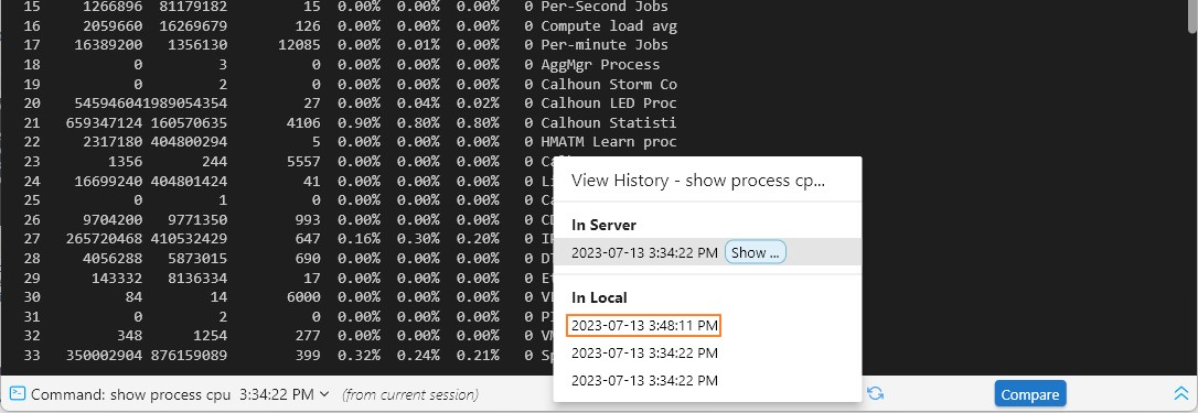 Select a command in Command area and the data of the current command output is displayed in the main screen, and you can select data from the Baseline area, then the Compare button is diaplayed for comparison.