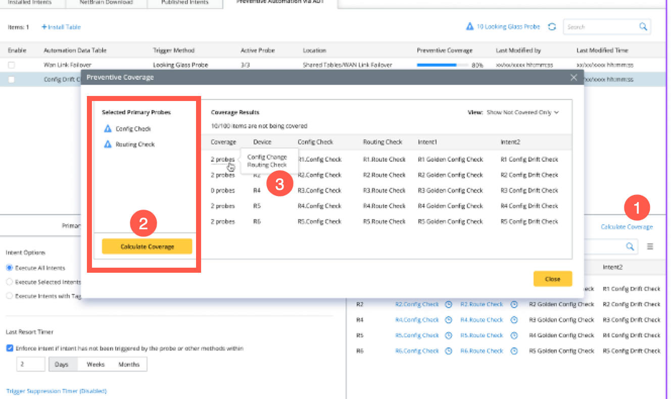 For example: You have a critical ADT table to manage critical WAN links and use the command show ip route  on looking glass devices to identify the critical route change. If any route change happens on looking glass device, it will trigger the intent execution. In some cases, the route change on looking glass devices does not necessarily be the WAN link of the ADT table affected. And in this case, you can configure the secondary probe on the WAN link devices using the command show ip route to verify the route entries on the WAN link devices are indeed affected.