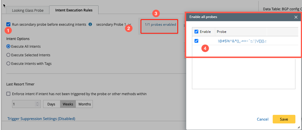 Information Note: The Secondary Probe may be triggered by different sources. So, the secondary probe should be associated with the Looking Glass Probe triggering the execution of Intents. If the Secondary Probe is triggered by any other Primary Probes, even if there is an alert, the Intents will not be triggered.