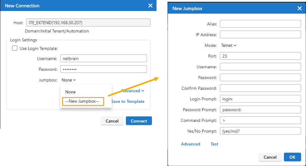 - NetBrain Connection — Enter a device hostname or IP address, and then select the matched device from the populated drop-down list. Then the Smart CLI automatically logs in to the device with credentials configured in the Private Network Settings of your NetBrain.