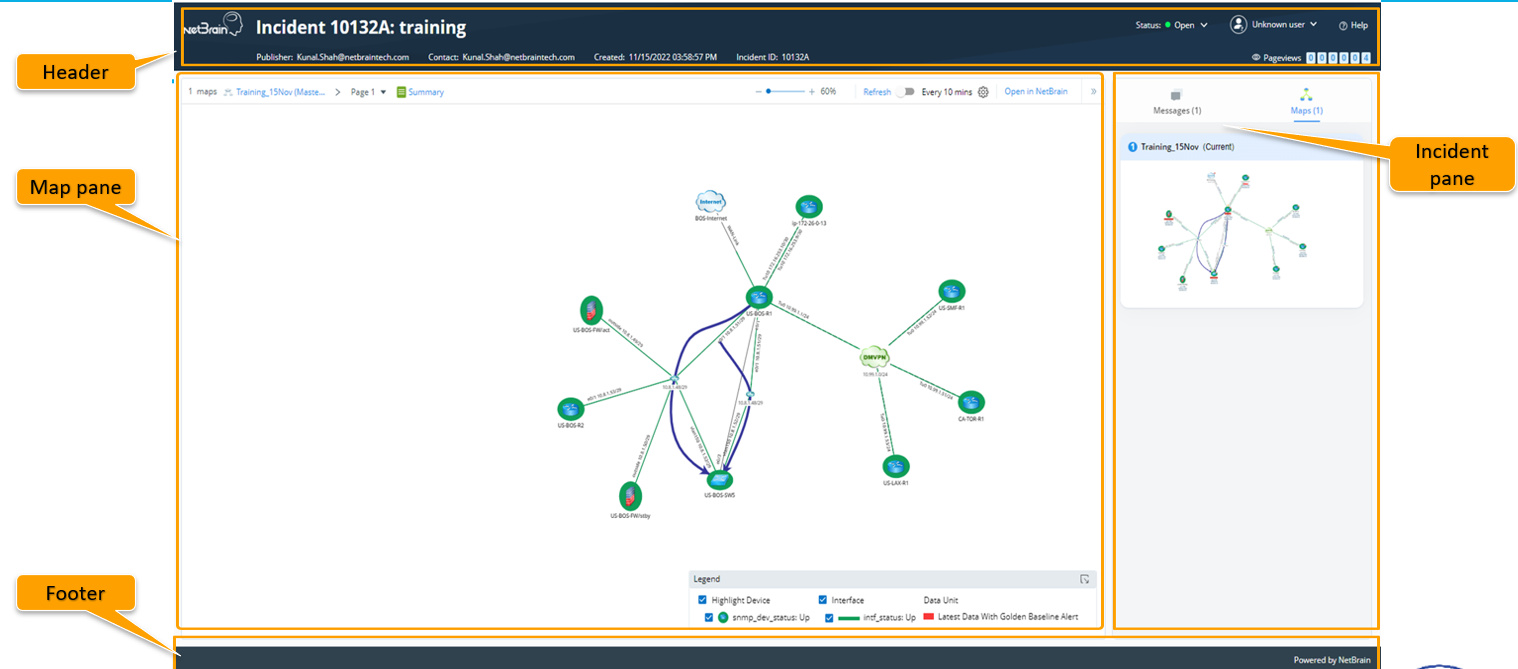 Incident Portal, independent of the NetBrain system, is a web portal, although it is connected to the web incident of the NetBrain system by allowing portal users to view the web incident and sync the messages in the collaboration sessions with the web incident. NetBrain users can set up an Incident Portal for external users to access an incident and join the troubleshooting process. Web incident users have control over what contents are shared in the incident portal by configuring the settings of an Incident portal. The messages triggered by TAF are also displayed in Incident Portal.