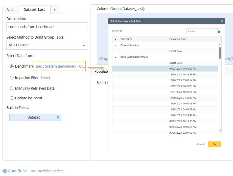 - Select Data from: Keep the default Benchmark option, click Select, then select the benchmark task (e.g., benchmark "01/03/2024" from Basic System Benchmarks for building this column group. For more information about the different types of benchmark task data, see Appendix (ADT Dataset).