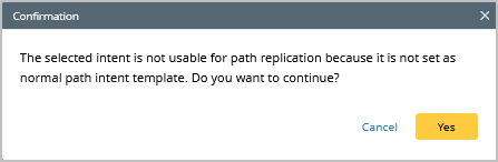 Intent templates are separated into two types based on Replication Logic Definition: Replication for Devices (called normal NIT), Replication for Paths (called Path NIT). It is noteworthy that only path intent templates are supported when the “Intent replication for path” method is selected, which also means only path variables are applied to intent replication. If a normal NIT not configured for path replication is selected for building the column group, a message will appear to notify you.
