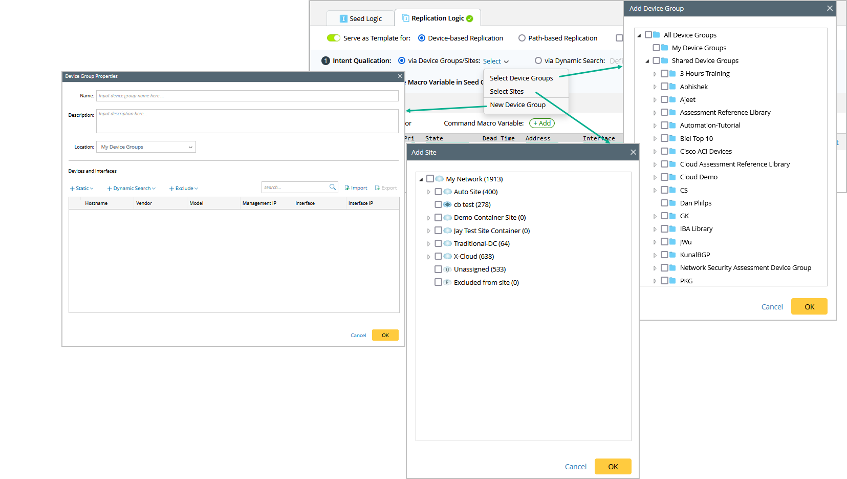 - Define via Device Groups/Sites method: Qualify devices by the defined device groups, Sites, or you can create new device group.