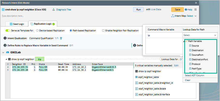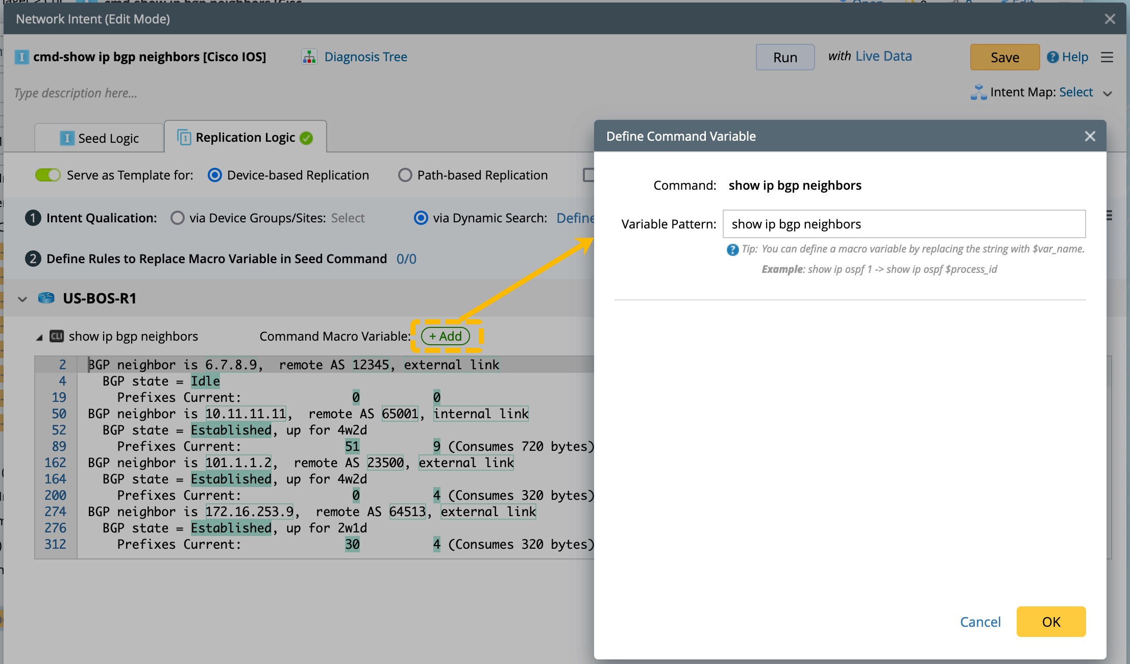 - Define the variable pattern, such as show ip bgp neighbors $ip. Once the variable pattern is defined, more settings are displayed for you to define, such as variable description, variable type, and default value.