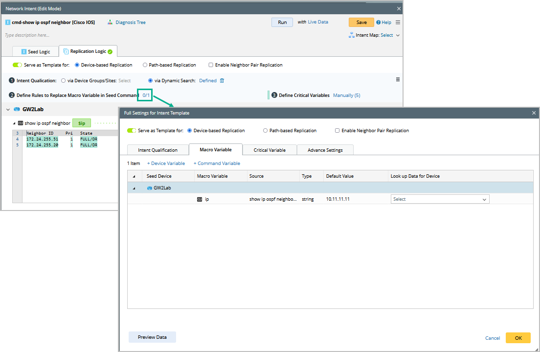 Note: If the "Enable Neighbor Pair Replication" checkbox is chosen, the macro variables for both hub and spoke devices will be visible in the "Neighbor Pair" tab. Devices without assigned hub or spoke roles will still appear in the "Macro Variable" tab.