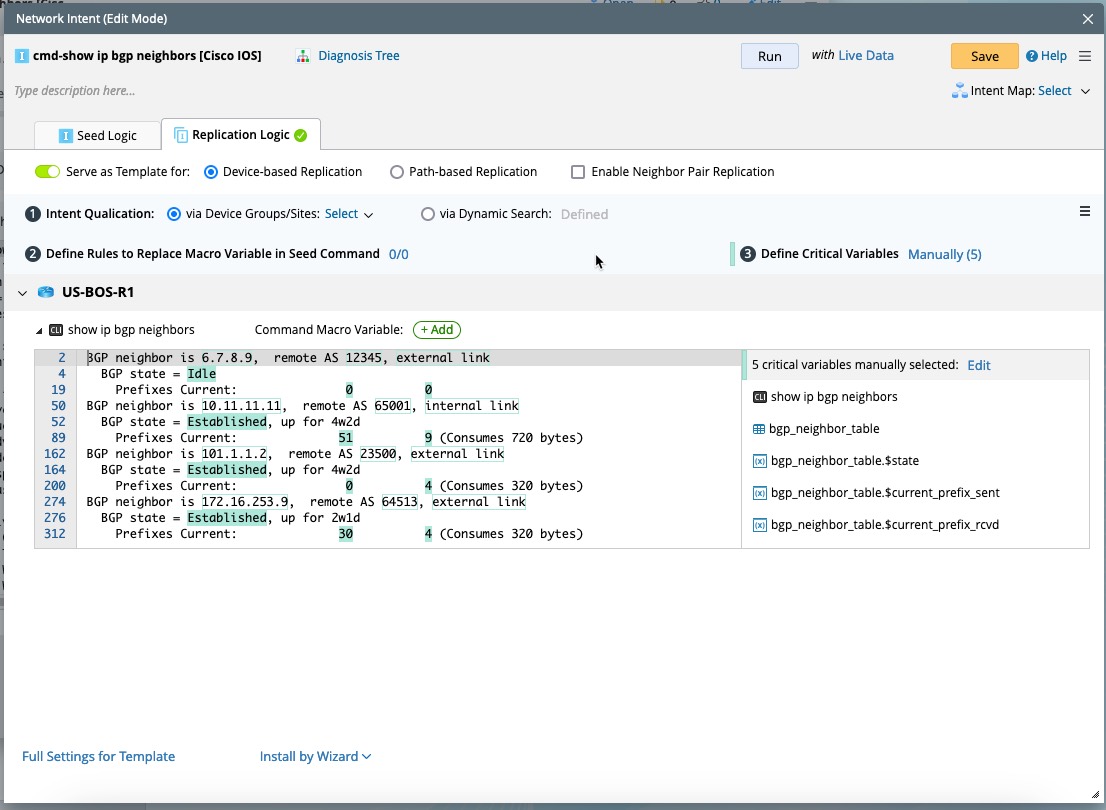 The system shows key replication logics under the Replication Logic tab in the intent editor. This tab displays all configurations related to intent replication, enable the Serve as Template for: switch and you will access to define Intent Qualification, Macro Variable for Seed Command, Critical Variable, and for more additional settings in Full Settings for Template dialog. You can easily find the settings related to intent replication and understand the key steps to configure an intent as template.