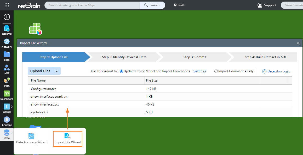- Use Case 3: Users may have a set of CLI data collected during network changes outside NetBrain and want to use intent to assess these data, the import file wizard makes it possible by allowing the ADT dataset to be built.