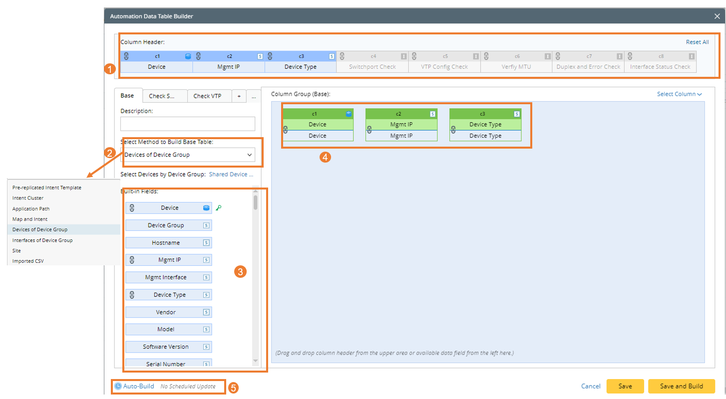 The key components of the Automation Data Table builder are described in the following table:Table 1- Key Components of Automation Data Table Builder No. Component Description 1 Column Header The ADT table headers are displayed on the top of the Automation Data Table Builder. Users can understand the ADT structure and drag and drop columns to the column group area. 2 Method - Method to Build Base Table: Provide 8 methods to build the base table.