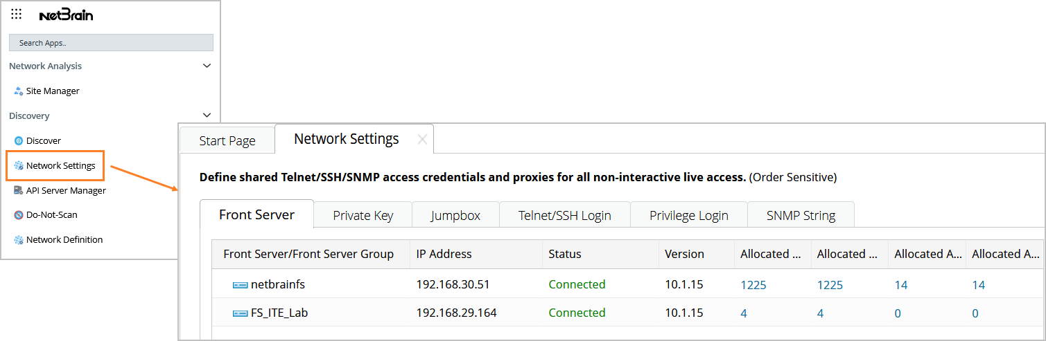 NetBrain Network Settings collects all the credentials used to live access devices and retrieve device data. Only the users with the privilege to manage the domain can configure and share the Network Settings.