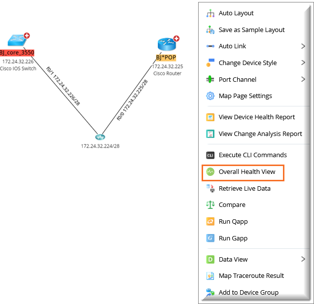 Example: Run Overall Health View on core devices to get key performance metrics (e.g., CPU/MEM usage, interface traffics) via SNMP or API.