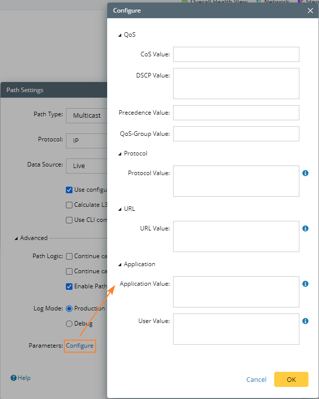 Tip: The parameters displayed in the path settings can be predefined on the Domain Management page (Operations > Domain Settings > Path Parameters Settings). See Built-in QoS Parameters for more details. |