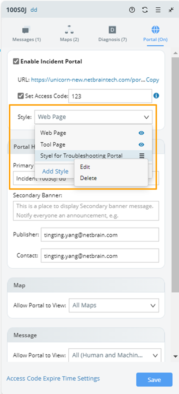 Portal styles can be selected in the Portal pane of a web incident. New portal styles can also be added.