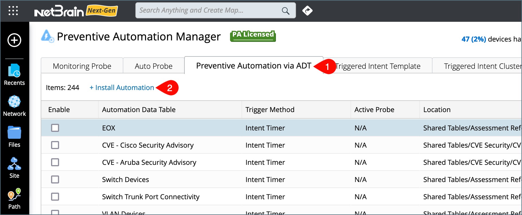 - Open the Preventive Automation Manager from the netbrain desktop and go to Preventive Automation via ADT tab.
