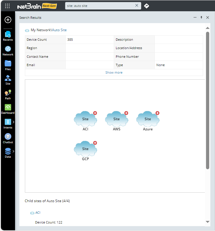 - Press the Enter key on your keyboard to start searching. The corresponding site map is shown and all child sites or devices under the site are listed.
