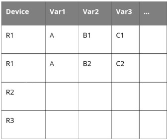 Device “R1” has more than one row in ADT with different parameters. To build this ADT, users have to use NIC with signature variables, but it is complex to be maintained and used by users and NetBrain engineers.