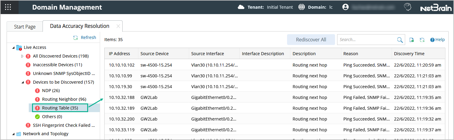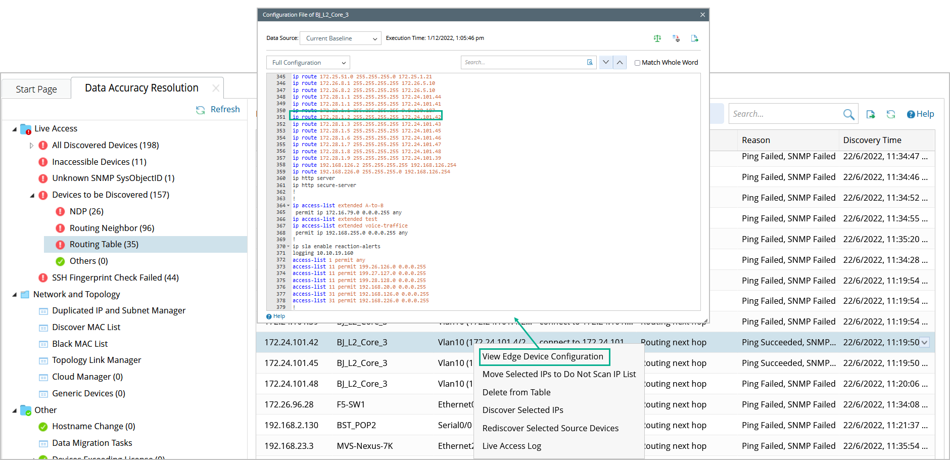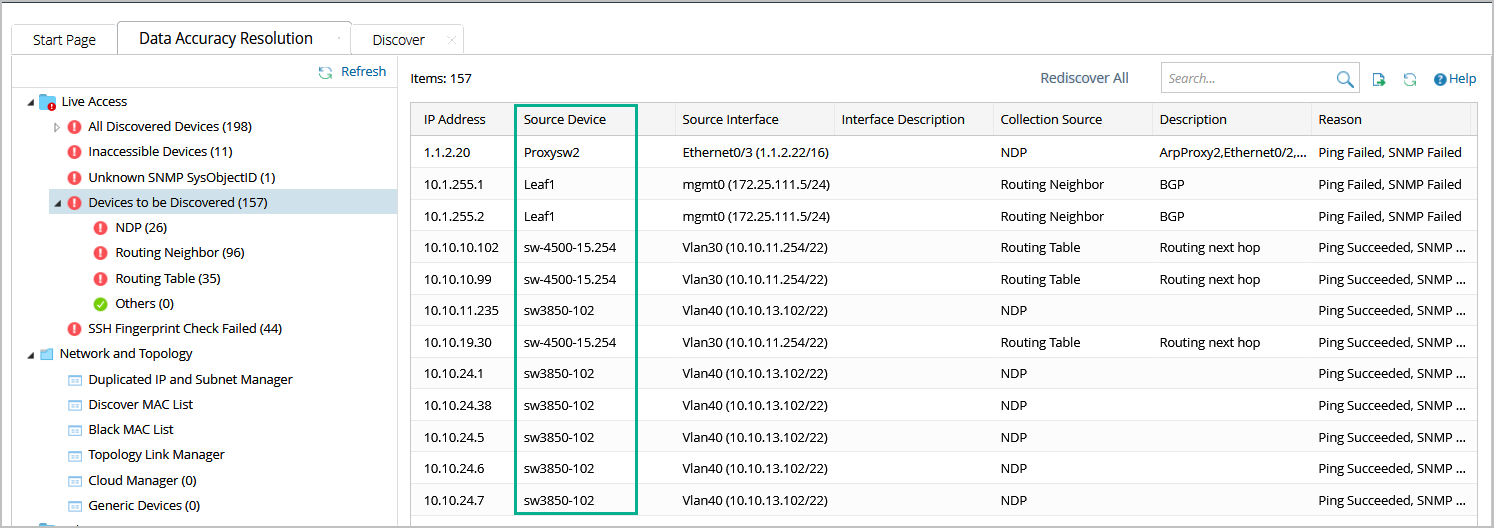 - Rediscover Selected Source Devices: You can launch a new discover task using the Source Device as the seed and the depth set to 1. After rediscovering the source device, the system will automatically clear the associated entries that are no longer in the Source Device’s NDP table.