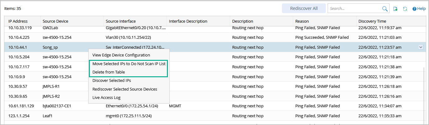 - If you wish to access this IP, please check its CLI and SNMP access. If you wish not to access this IP anymore, you could either Move Selected IP to Do-Not-Scan list or Delete from Table (however, it may be added back in the next Discover task if you delete it from the table).
