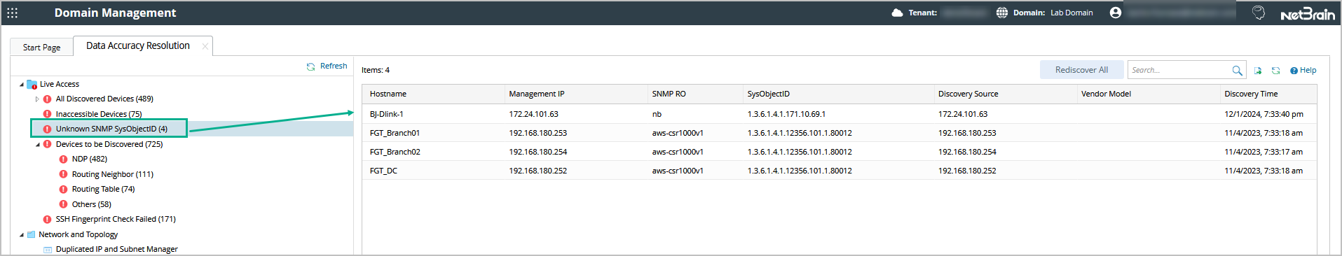 - In the Data Accuracy Resolution tab, select Unknown SNMP SysObjectID in the left pane. The devices with unknown SNMP sysObjectIDs are listed.