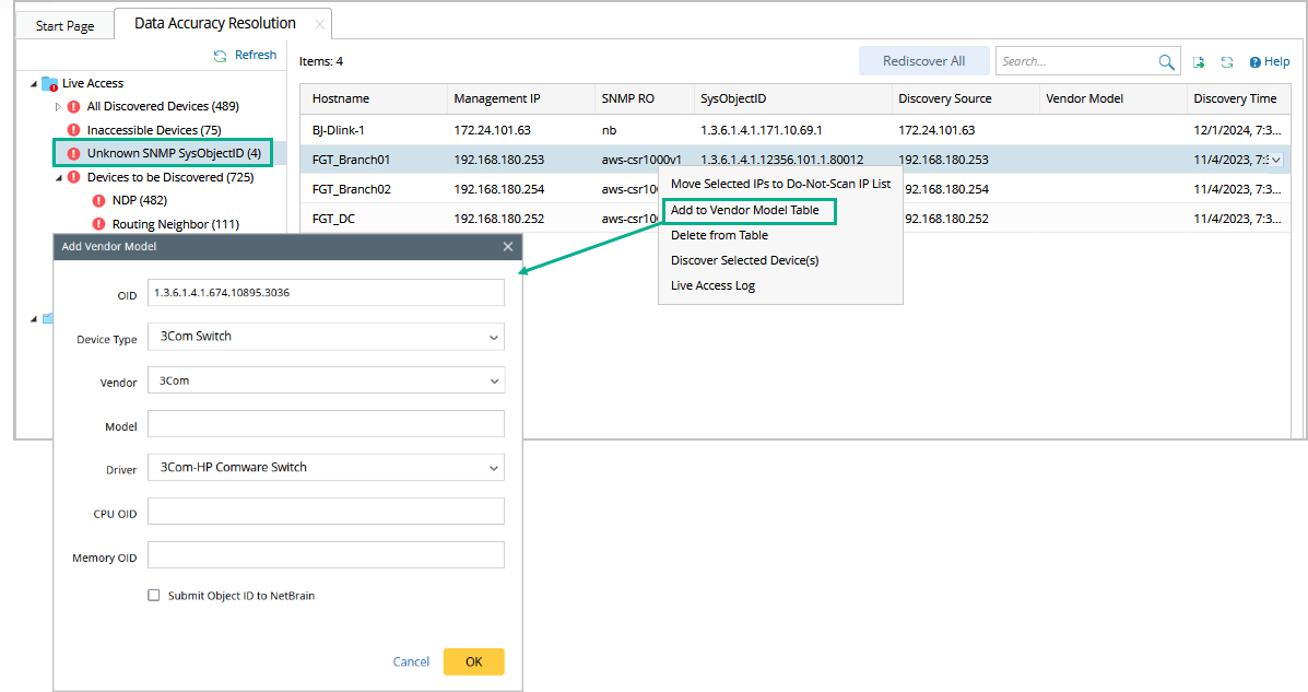 - Add the unknown SNMP sysObjectIDs to the Vendor Model table.