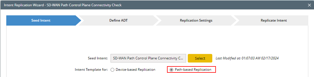 Prerequisites: The selected seed intent (for example, the intent "SD-WAN Path Control Plane Connectivity Check (Viptela vEdge)") is configured to be a path-based intent template.