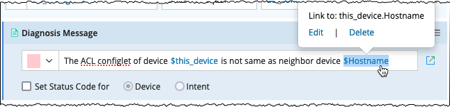 Note: When executing an intent to check the match between a device and its neighbor devices, you can define a diagnosis message that specifies the mismatched neighbor device. Use the variable $this_device.Hostname for other device and $this_device for the host device in the diagnosis message. This ensures that device names are accurately reflected in the messages upon intent execution.