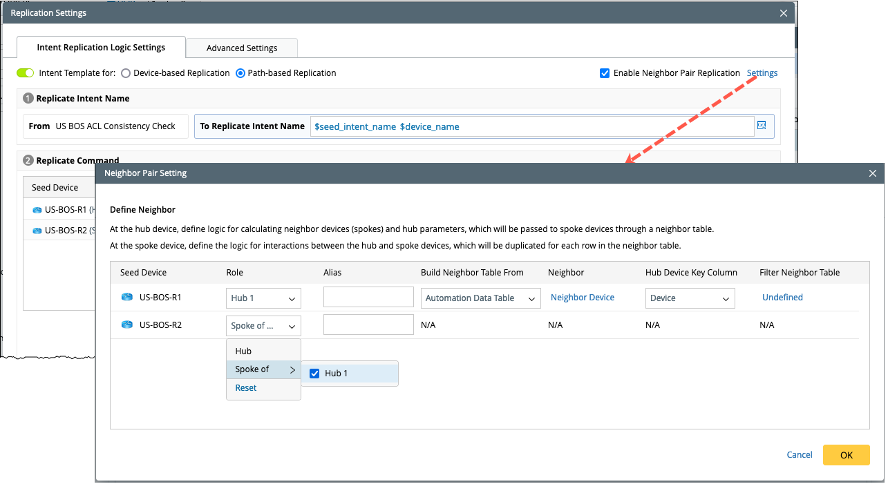 - Assign roles for the seed devices. Device US-BOS-R1 is the hub device and US-BOS-R2 is spoke device of US-BOS-R1.