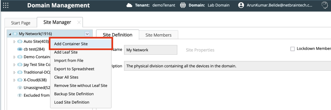 - In the Site Manager, right-click the My Network or any other container sites (