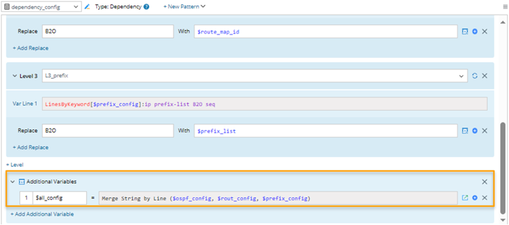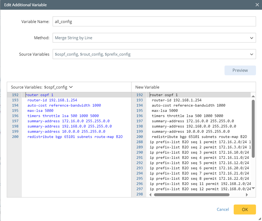 - Select one source variable to locate the text lines having characters to be replaced. If variable is inserted (in the current use case, variable $ospf_id is inserted), it will be converted to variable template for finding texts to be replaced.
