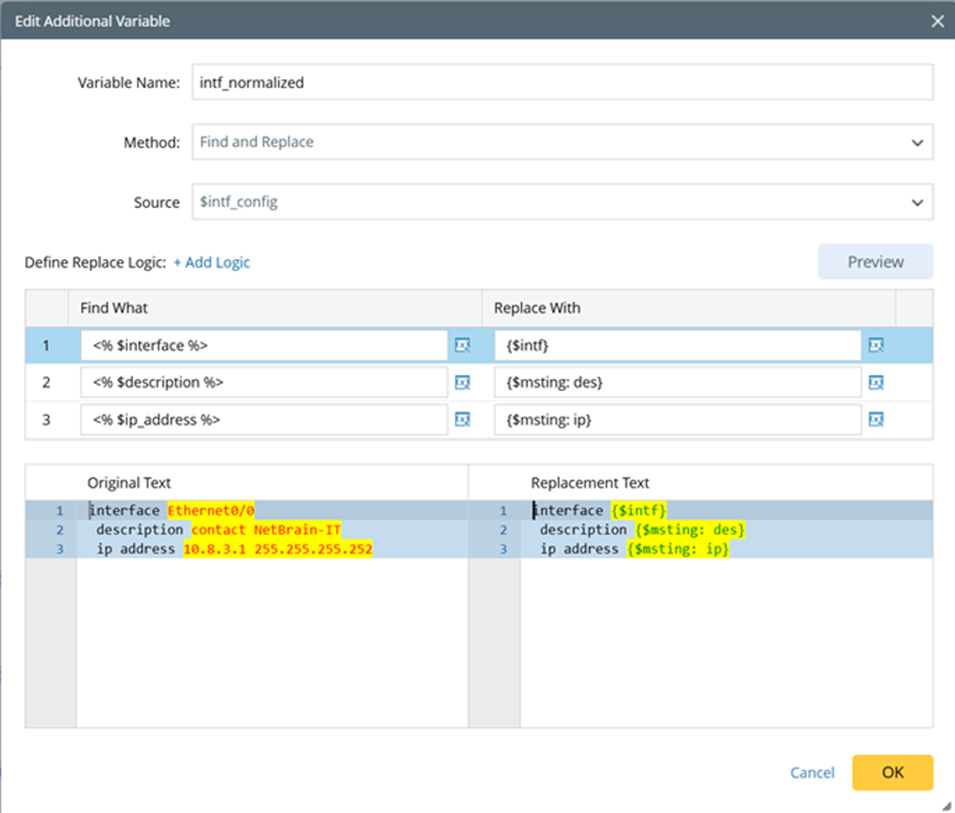 - Click Add Additional Variable, then In the Edit Additional Variable window, select the Find and replace method, then replace the variables $interface, $description, $ip_address (these variables will be converted to corresponding variable template ‘<%$var%>’) with the input texts. The final replacement results can be previewed in the bottom area.