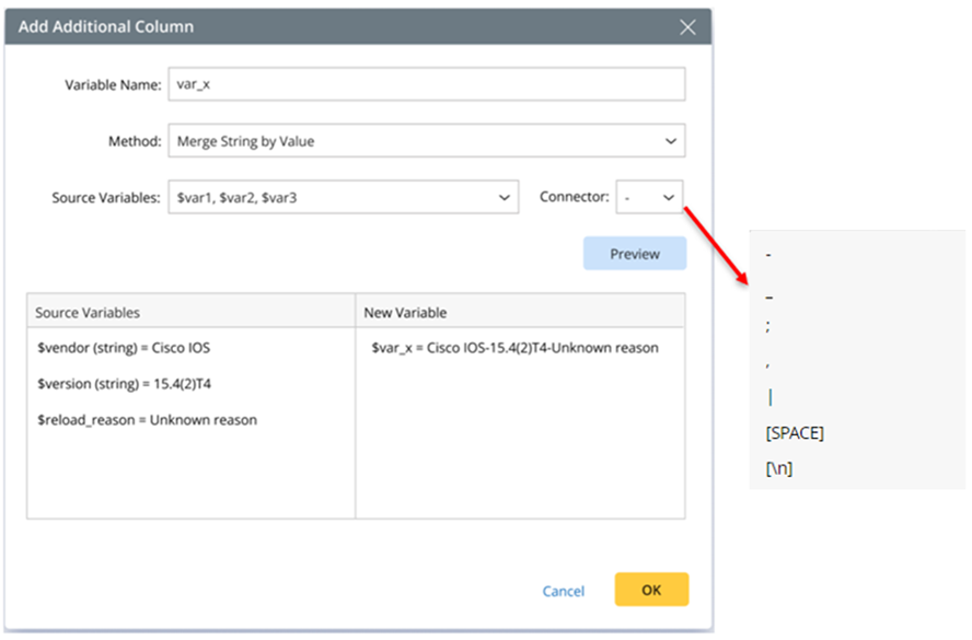 By this method, selected source variables will be merged via connectors “-“, “ _”, “ ;”, “,”, “|”, “Space”, and “\n” to create new variable.