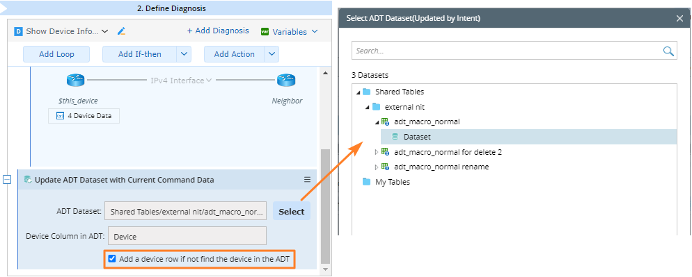 Note: When adding the current device and command pair to an ADT dataset, if the current ADT does not have this device row, you can select Add a device row if not find the device in ADT check box to add a row to this ADT and automatically fill in data for the corresponding device and dataset columns. |