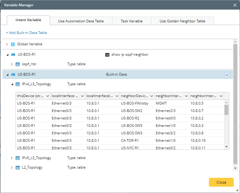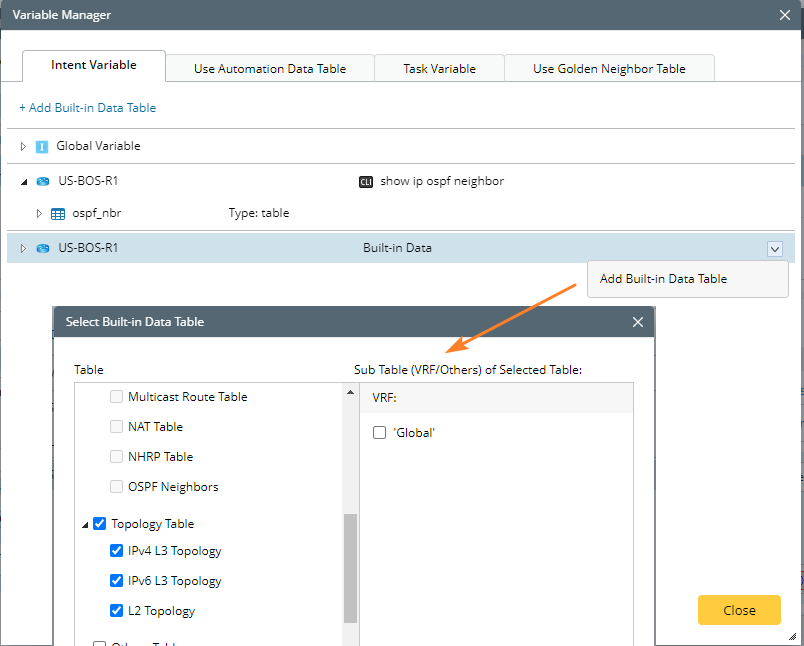Note: VLAN Group and Subnet tables can also be added as intent varibles for intent diagnosis. |