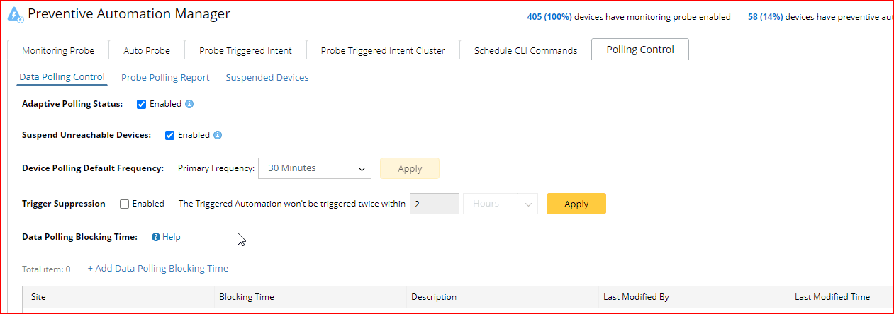 In some occasions you may need to temporarily turn off the adaptive polling (due to network change or network outage) and resume the adaptive polling after the network change is completed. You can enable/disable the adaptive polling for the entire system in the Data Polling Control tab. Once the adaptive polling is disabled, the following tasks won’t be executed: