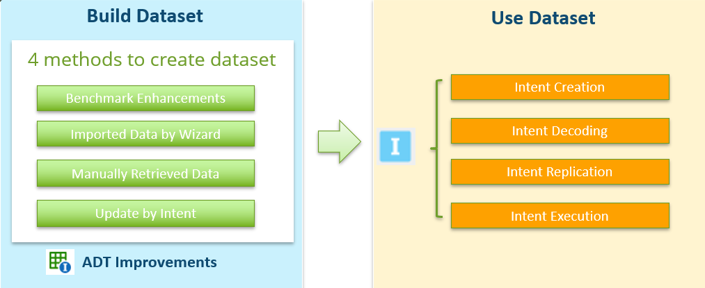 In ADT, four methods of building ADT Dataset are introduced to add device configuration files and CLI commands as links into dataset column, serving as data source for intent creation, intent decoding, intent replication, and intent execution. The following diagram illustrates the workflow of Dataset.