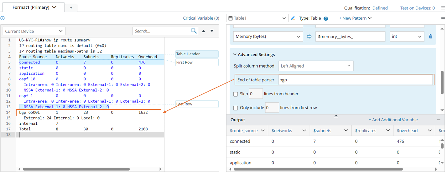 By default, the parsing process of a Table Parser stops when there is a blank line (“^" or "$” is used as the identifier) in the text. If a blank line is intended to be in the text by design, you can redefine the identifier. For example, if you are not interested in the data of BGP devices, set it as “bgp” as follows, so the parsing process will not stop until the line includes “bgp”. In this example shown in the diagram below, parsing will stop at line 14.