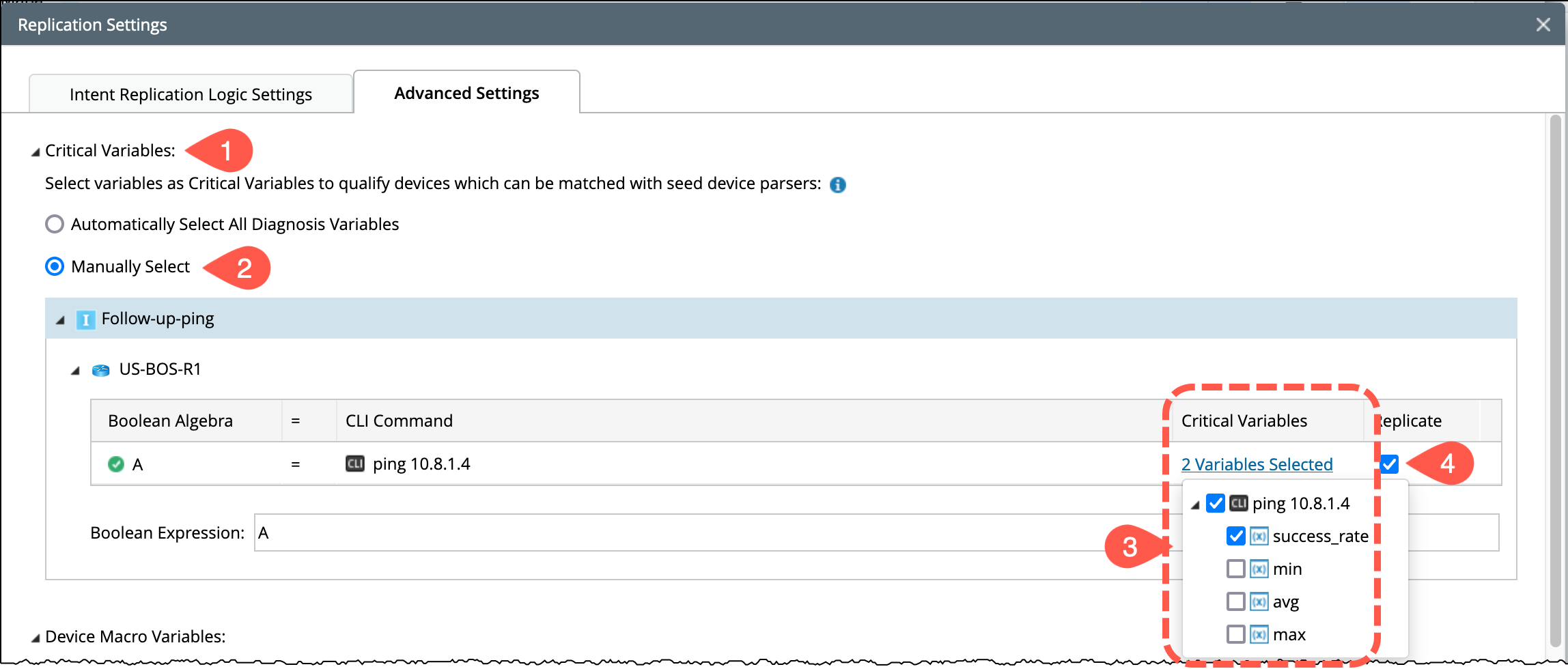 Select specific variables as critical variables. If these variables from the seed device match those on the target device, the target device will qualify for replication. To set critical variables: