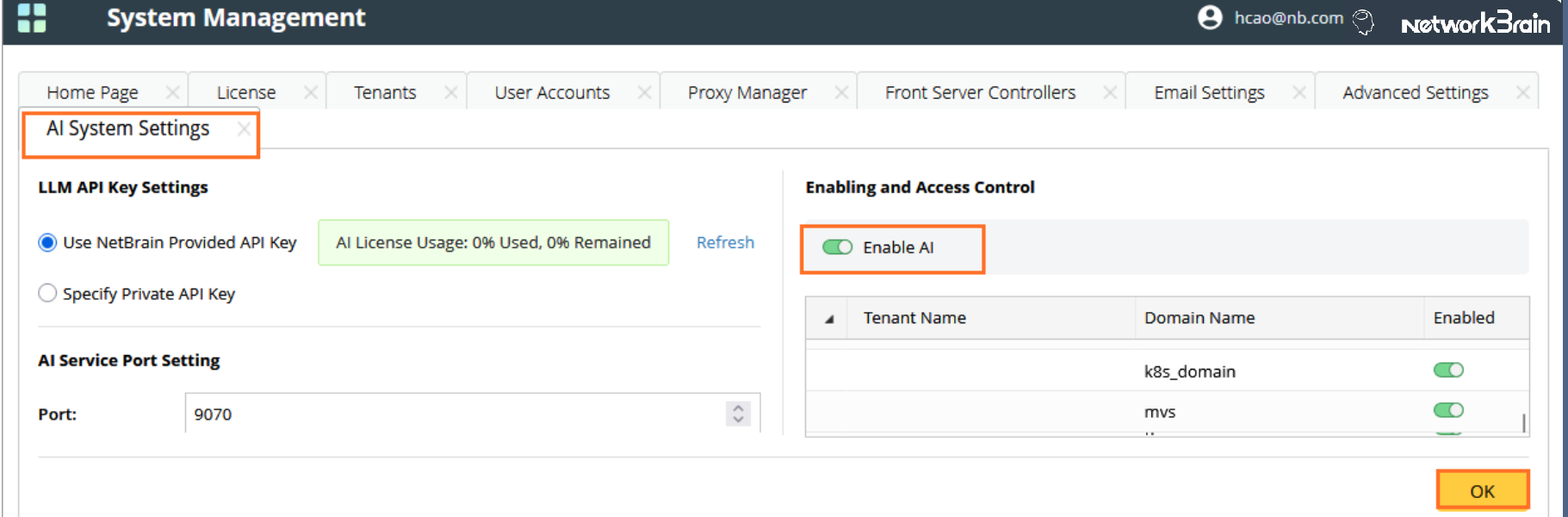 menu and select AI System Settings. - In the Enabling and Access Control section, toggle Enable AI to ON.