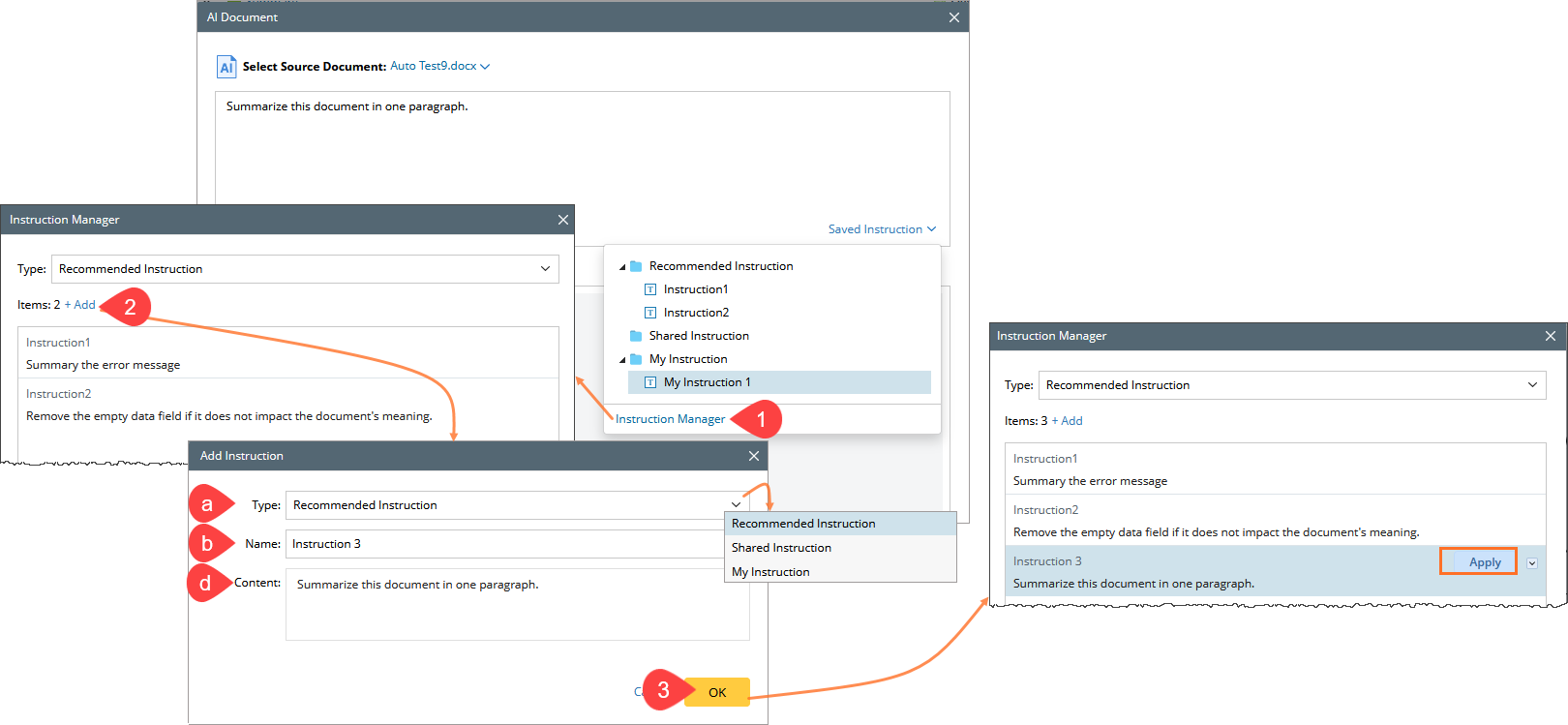 - Click OK to save the instruction. You can Apply the instruction to use it immediately for the current document. This overwrites the existing content