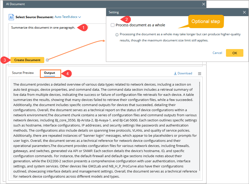settings icon to process the document as a whole for higher quality (this takes longer and is not recommended for large files). - Click Create Document to start the AI refinement process.