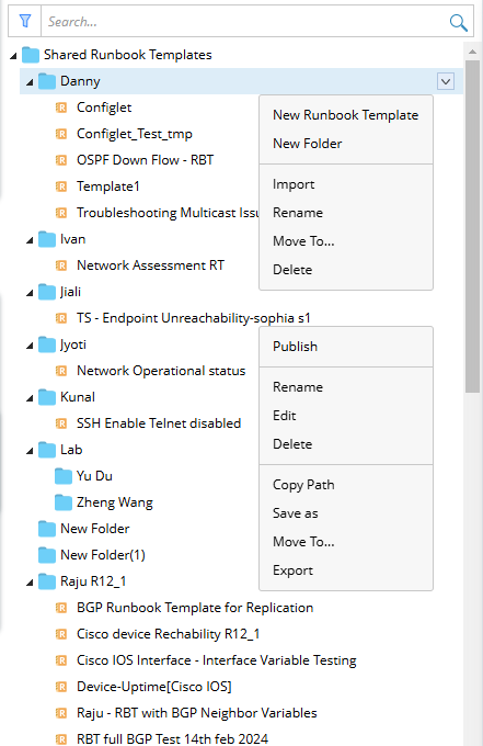 - You can also perform the following actions for the RBT folder and runbook template.