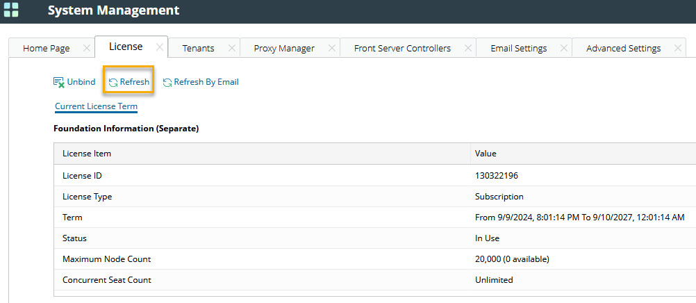 - Navigate to the License tab on System Management page and click Refresh.