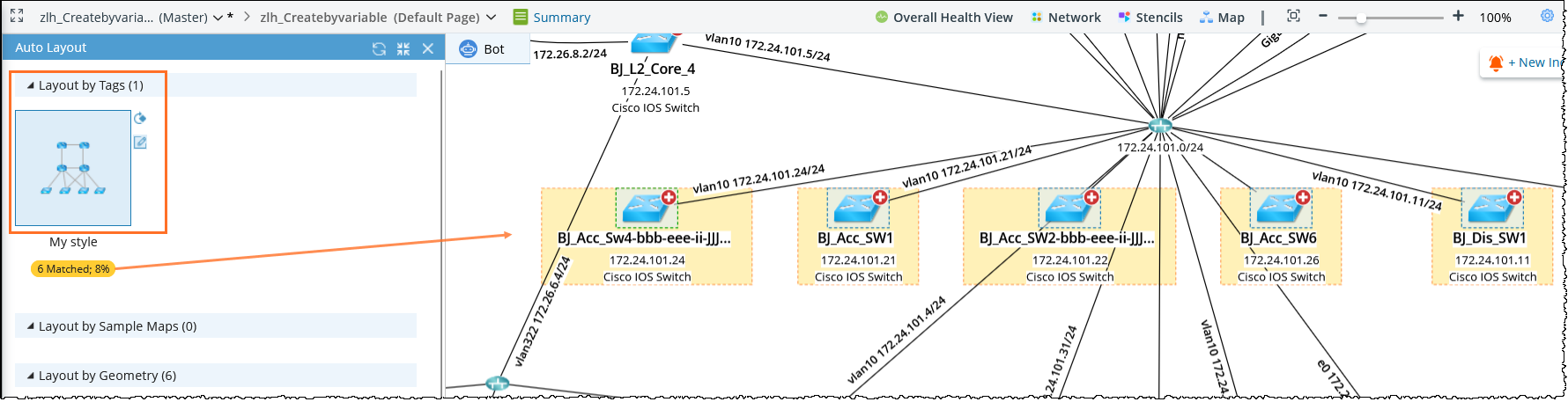 ![]() | Note: The “X Matched; Y%” indicator shows how closely the selected template matches the current map. The percentage is based on how many devices the template applies to. Click the X Matched; Y% link to highlight those devices on the map.e. |